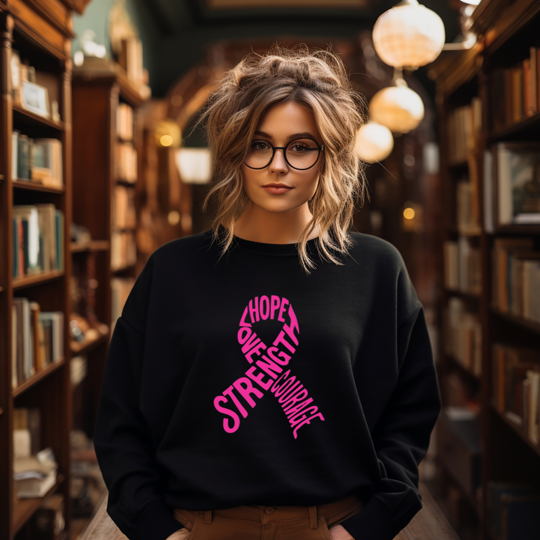 Show your support for someone in your life who has battled or is battling breast cancer - especially if that person is you!   These crewnecks state all the uplifting words required to keep you fighting and the iconic pink ribbon that is the symbol for the fight.