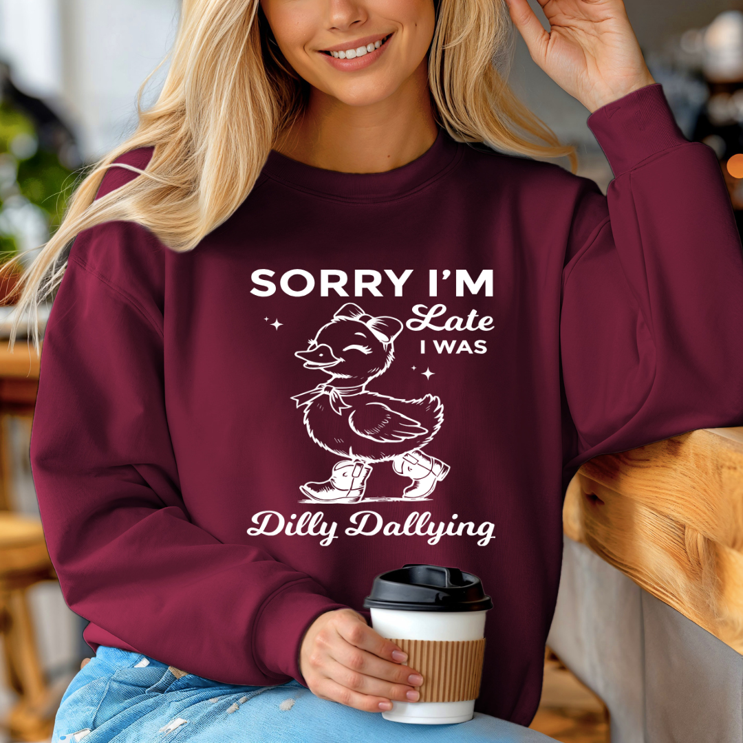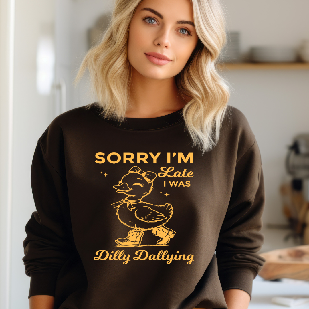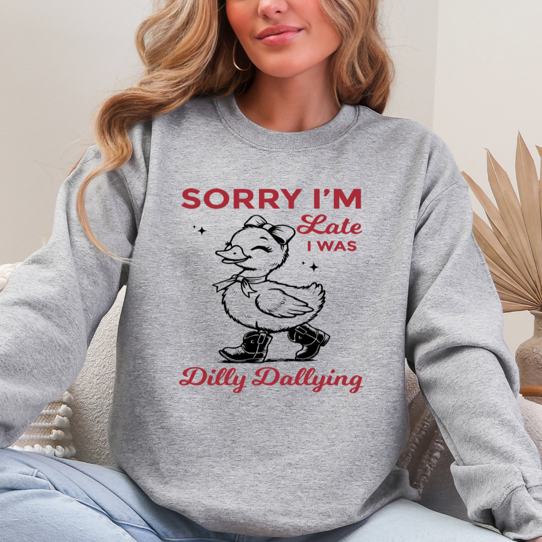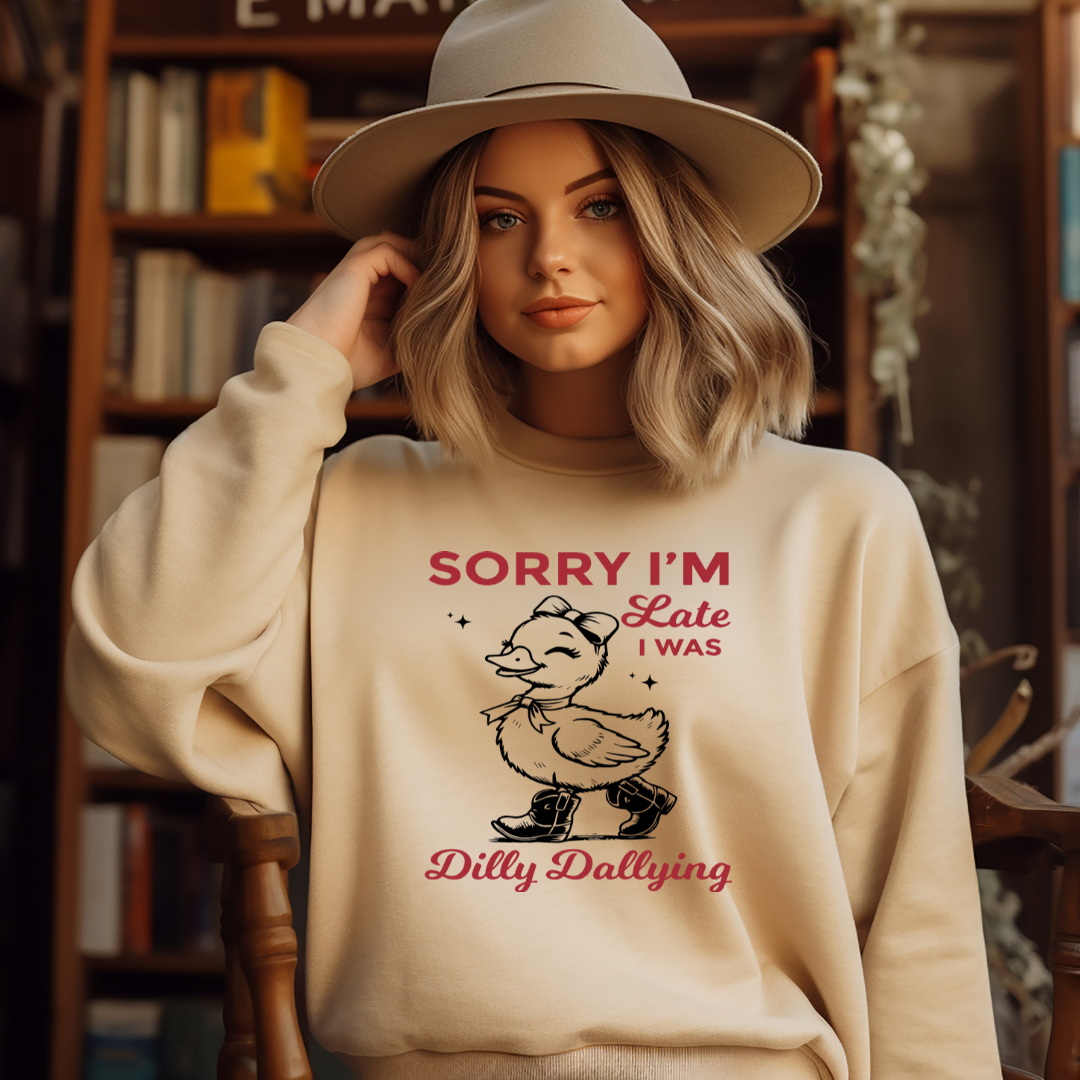 This crew is for the late girlies, the dreamy wanderers, and anyone who loves a playful excuse that is hilariously relatable! Featuring an adorable little duck and a playful, relatable phrase. Perfect for animal lovers, humor enthusiasts, and anyone who embraces a laid-back lifestyle, this comfy sweater is a must-have! Whether you pair it with jeans or shorts, you'll achieve a casual yet effortlessly fashionable look.